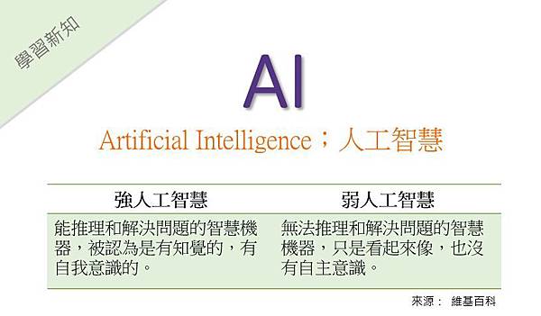 (Artificial Intelligence, AI)又稱人工智能,指由人製造出來的機器它所表現出來的智慧。